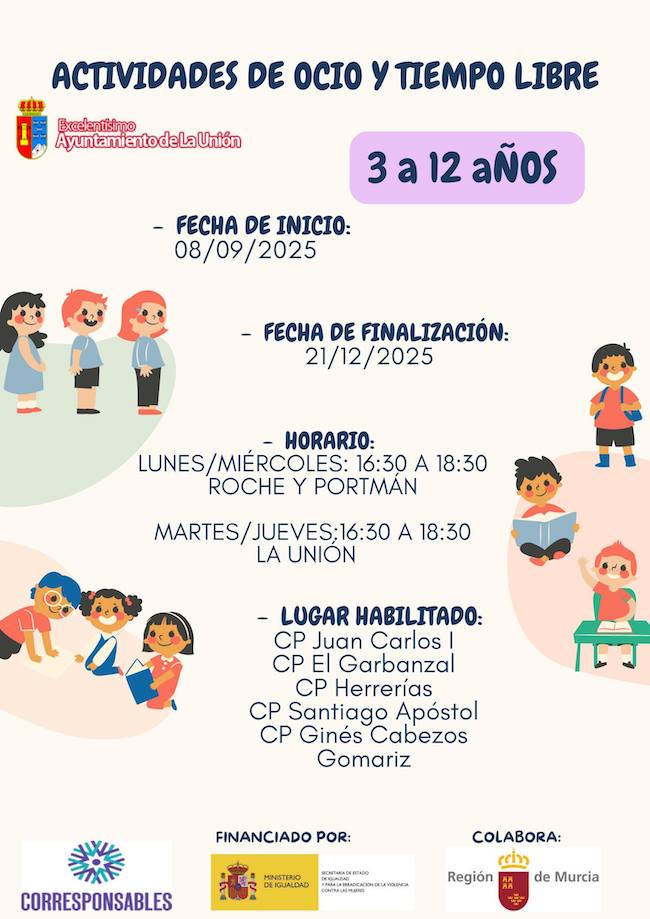 Actividad financiada por el Ministerio de Igualdad y el Plan Corresponsables, con la colaboración de la Región de Murcia y el Ayuntamiento de La Unión. Es una estupenda oportunidad para divertirse, aprender y compartir en un espacio seguro y educativo.