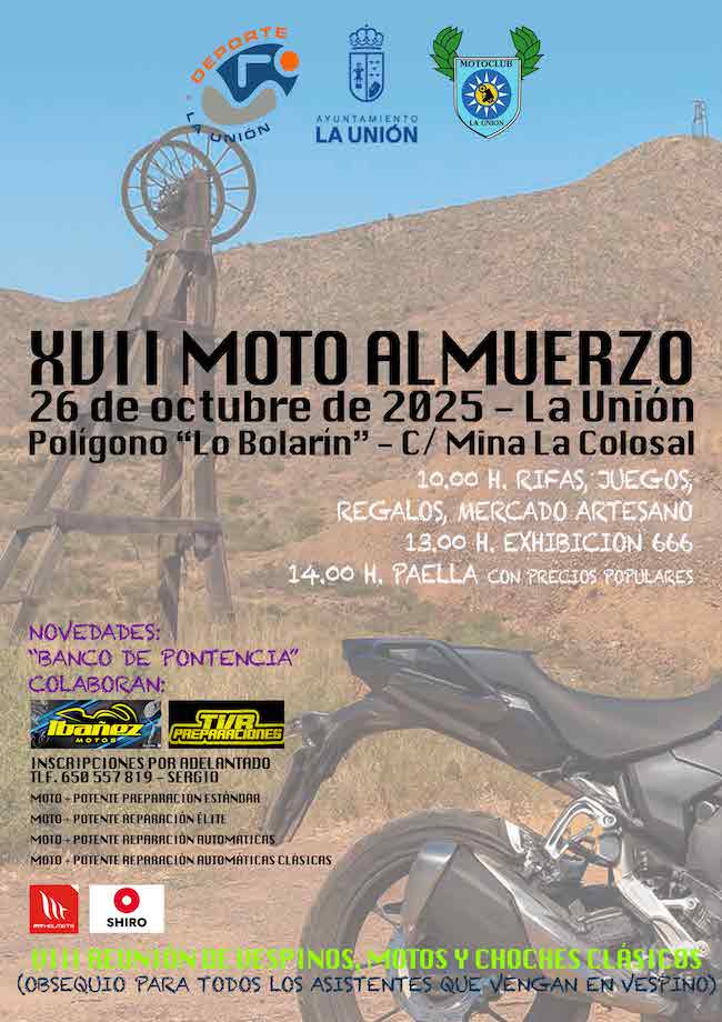 La Unión volverá a rugir con el motor el último domingo de octubre con la celebración de la décimo séptima edición del gran encuentro motero organizado en el polígono industrial Lo Bolarín por el Moto Club La Unión, en colaboración con el Ayuntamiento de La Unión. También acogerá la VIII reunión de vespinos, motos y coches clásicos.