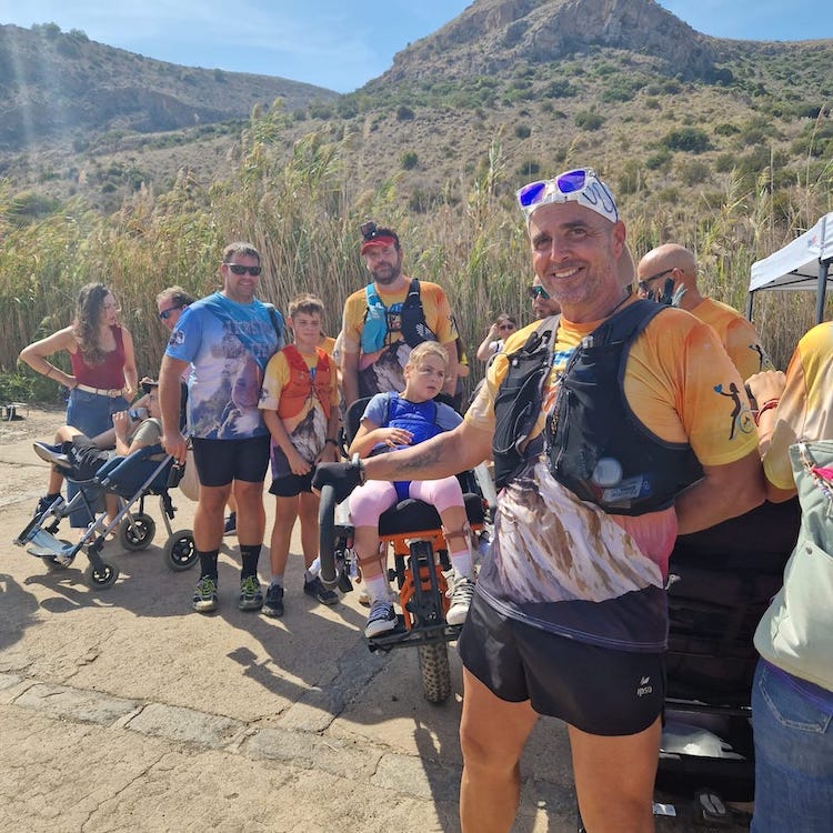 En la aventura celebrada el pasado sábado, Joaquín Susmozas con su hija Julia, que padece una enfermedad rara, y resto de integrantes del Sector Tierra, recorrieron 21 kilómetros con 650 de desnivel positivo entre Cala Reona y Portmán.