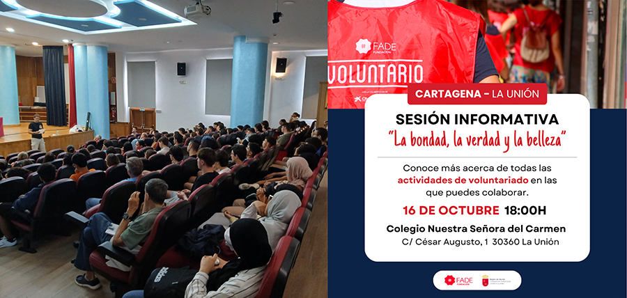 2. Fundación FADE, la plataforma que ayuda a las personas a través del voluntariado, bolsa de trabajo y formación gratuita anuncia una sesión informativa para voluntariado para este próximo jueves en el colegio de Nuestra Señora del Carmen (Vedruna-Carmelitas), en La Unión. La sesión se titula 'La bondad, la verdad y la belleza' y comenzará a las 18 horas. Se presentarán las distintas actividades de voluntariado que FADE desarrolla en la comarca de Cartagena y La Unión, dirigidas a promover la solidaridad y el acompañamiento a personas en situación de vulnerabilidad. La iniciativa cuenta con la colaboración de la Región de Murcia, a través de la Consejería de Política Social, Familias e Igualdad.
