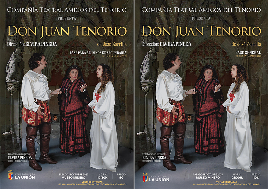 La Compañía Teatral Amigos del Tenorio representará la clásica obra de José Zorrilla, “Don Juan Tenorio”, el próximo sábado 18 de octubre en el Museo Minero de La Unión, en una cita que promete revivir uno de los textos más emblemáticos del teatro español.