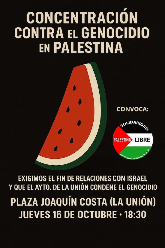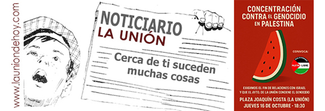 La organización 'Palestina libre' de la Región de Murcia, del que forman parte activistas de La Unión, hace un llamamiento para este jueves por la tarde en la plaza de Joaquín Costa para mostrar el rechazo del genocidio que comete Israel con Palestina y para pedir la condena por parte del ayuntamiento.