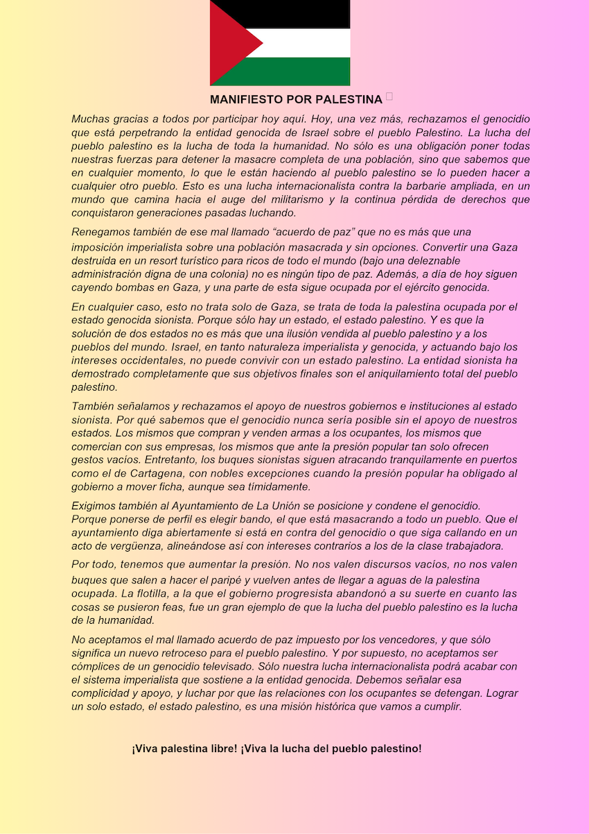 Durante el acto se leyó un manifiesto en el que se recordó que “la lucha del pueblo palestino es la lucha de toda la humanidad” y que no hay paz posible sobre los escombros de Gaza. El texto denunció el auge del militarismo global, la hipocresía de los gobiernos europeos y el silencio cómplice de las instituciones ante la masacre del pueblo palestino.