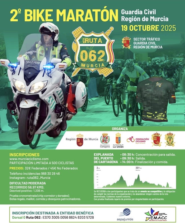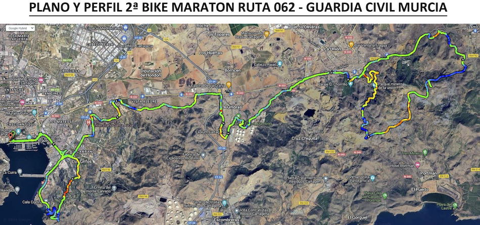 El recorrido total es de 56,97 kilómetros, pudiendo participar los que lleven bicicletas y e-bike. El coronel jefe de la quinta zona, Francisco Pulido; y el delegado del Gobierno en la Región de Murcia, Francisco Lucas; acompañados de general jefe de la Agrupación de Tráfico de la Guardia Civil, Tomás García; la jefa provincial de Tráfico, Virginia Jerez; y el comandante jefe del Sector de Tráfico de Murcia, Francisco Utrabo; cortarán la cinta inaugural a las 9.15 horas en el puerto de Cartagena, siendo 15 minutos más tarde para cuando se ha fijado el momento en el que el grupo se pondrá en movimiento. En las inmediaciones del punto de salida y meta de la carrera solidaria se ha organizado una exhibición de recursos técnicos y humanos, que incluye actividades para los más pequeños.