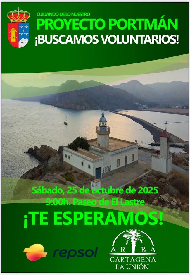 ARBA Cartagena-La Unión anuncia que este sábado llevará a cabo la segunda convocatoria del ‘Proyecto Portmán: cuidando lo nuestro’, que consiste en la retirada de basura y en la reforestación de los entorno del faro y de la playa. En este caso, el encuentro tendrá lugar en el paseo que rodea el arenal costero.