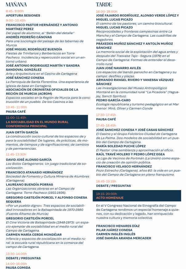 'La Cocina Económica de la Unión 1893-1924' fue el título de la ponencia que formó parte de la primera jornada V Congreso Etnográfico del Campo de Cartagena, que se está desarrollando en el edificio CIM de la Facultad de Ciencias de la Empresa de la Universidad Politécnica de Cartagena, junto al puerto. Esta edición lleva como título 'Los espacios de sociabilidad: pasado, presente y futuro', en torno al cual se llevan a cabo exposiciones y ponencias de personas entendidas en la materia. El programa de la segunda jornada de hoy es el siguiente: