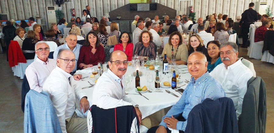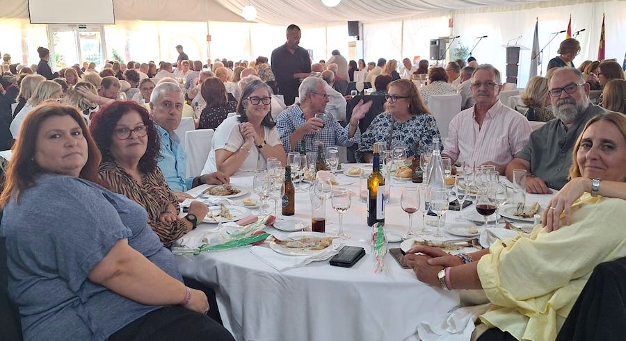 La comida benéfica organizada por la junta local de La Unión reunió a doscientas personas en un ameno y solidario encuentro, en el que también se volcó el comercio con sus donaciones y que incluyó el humor de la chirigota 'Los robinsones de La Isla', a los que se observa en la foto superior.