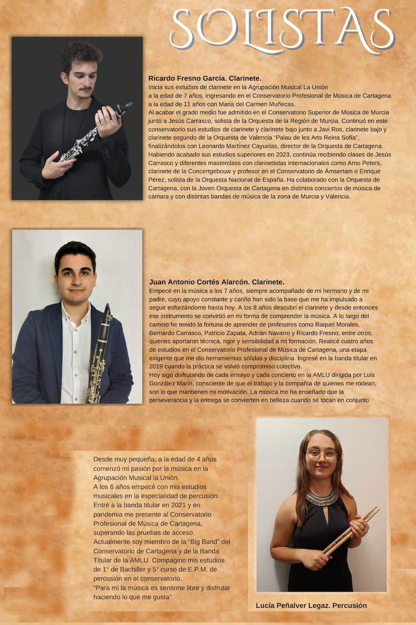 El concierto que la Agrupación Musical La Unión dedicará el próximo sábado a la patrona de la música será el estreno oficial de ocho nuevos componentes de la banda titular. Además, Lucía Peñalver Legaz, Ricardo Fresno García y Juan Antonio Cortés Alarcón (fotos sobre estas líneas) serán los solistas que acompañen diversas piezas de la actuación, que tendrá lugar en el auditorio Museo Minero con entrada gratuita.