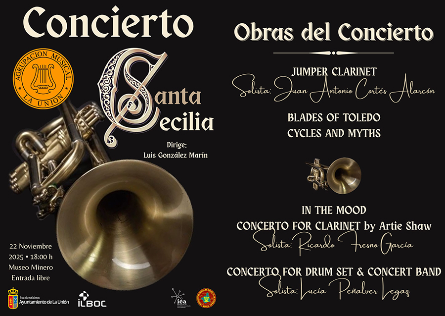 El próximo sábado 22 de noviembre tendrá lugar el concierto de Santa Cecilia de 2025 en el salón de actos del Museo Minero de La Unión. Se incorporarán a la banda titular los 'músicos recogidos' el pasado sábado 8 de noviembre (pinchar aquí) y, además, tres solistas enriquecerán la interpretación de diversas piezas por parte de la banda.