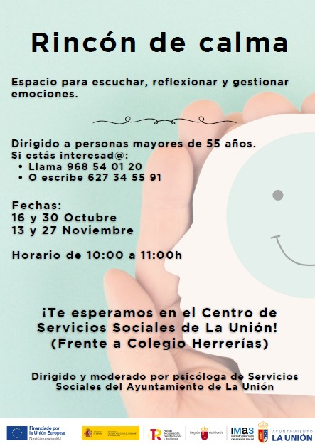 El servicio del Ayuntamiento de La Unión ha celebrado tres de las cuatro citas del espacio 'Rincón de calma', que modera una psicóloga, y tiene habilitado un 'Buzón de la soledad' en la web municipal para que los vecinos comuniquen situaciones en las que hay personas que están o se sienten solas, siendo un técnico el que intervendrá para buscar soluciones a esa situación.