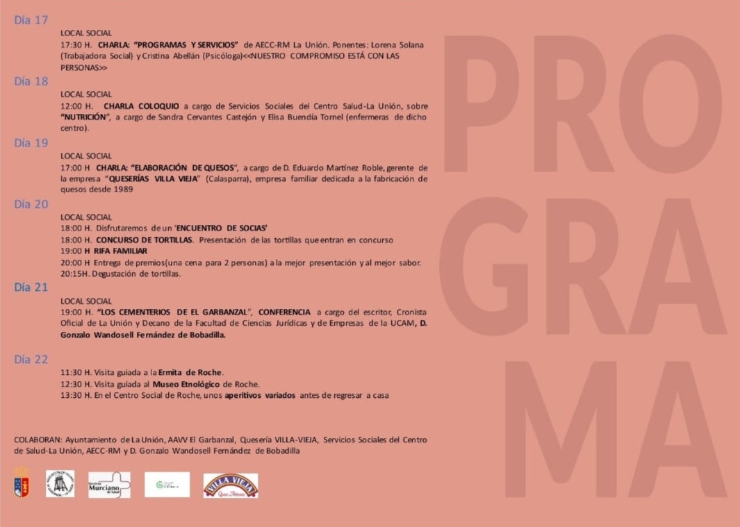 La tercera edición de la ‘Semana cultural’ se puso en marcha en la tarde de ayer con una charla sobre programas y servicios de la AECC-RM-La Unión, que tuvo comoponentes a la trabajadora social Lorena Solana y a la psicóloga Cristina Abellán, y esta mañana continuará con otra sobre ‘Nutrición’. El programa de acgtos también incluye un concurso de tortillas, una conferencia de Gonzalo Wandosell sobre los comenterios de la villa y visita guiada a Roche, entre otras propuestas.