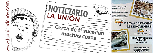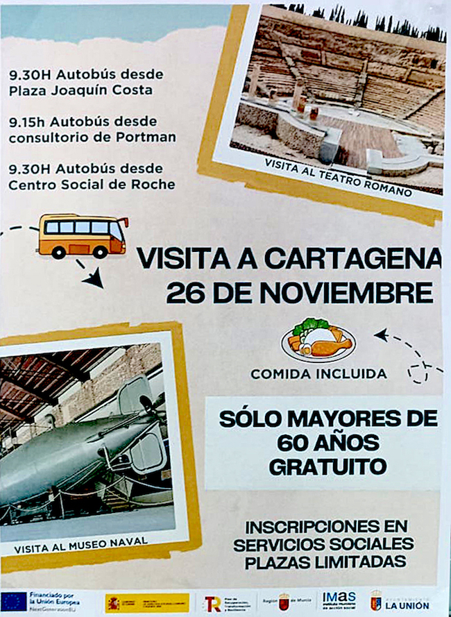 El autobús recogerá a las personas inscritas en Servicios Sociales el próximo miércoles en la ciudad de La Unión y en las pedanías de Portmán y Roche. El destino será el Teatro Romano y el Museo Naval. La comida está incluida y las plazas son limitadas.