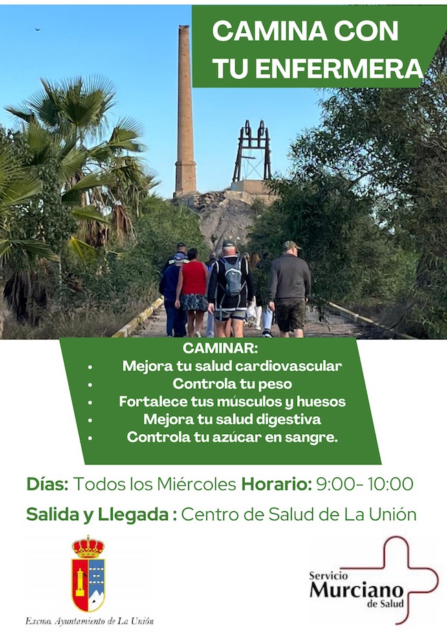 El Centro de Salud de La Unión, en colaboración con el ayuntamiento, organiza todos los miércoles por la mañana un paseo guiado gratuito que busca beneficios para el corazón y la circulación sanguínea, para el mantenimiento del peso y de los niveles de azúcar, para el fortalecimiento de huesos y músculos y para la salud digestiva.