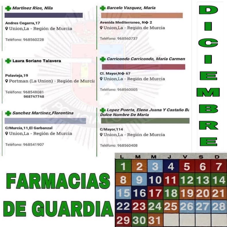 Aunque al principio publicábamos el cuadro de las farmacias de guardia de la ciudad de La Unión, hemos visto que es más completo y amplio el acceso al portal del Colegio Oficial de Farmacéuticos de la Región de Murcia, pues también incluye Portmán y Roche. Basta con ir a 'Buscar por municipio' seleccionar 'Unión (La)' y después, en 'Buscar por población', seleccionar La Unión (La), Portmán o Roche, apareciendo de inmediato las farmacias de cada localidad, indicando cual está de guardia y el horario de todas. De todas formas, en este artículo también publicamos el cuadro visual de la ciudad, que divulga la Policía Local: