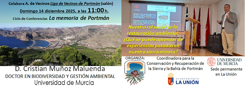 Cristian Muñoz Maluenda, doctor en Biodiversidad y Gestión Ambiental de la Universidad de Murcia, protagoniza la siguiente cita del ciclo de conferencias 'La memoria de Portmán', que tendrá lugar en la Liga de Vecinos el próximo domingo. El título de la charla es 'Nuestro rol social en la restauración ambiental: ¿Qué se puede aprender de experiencias pasadas en nuestra sierra minera?
