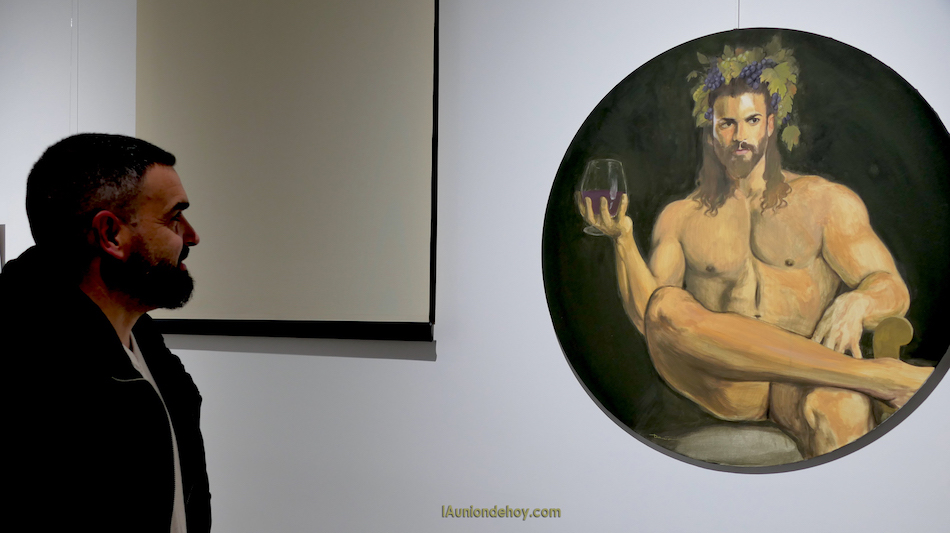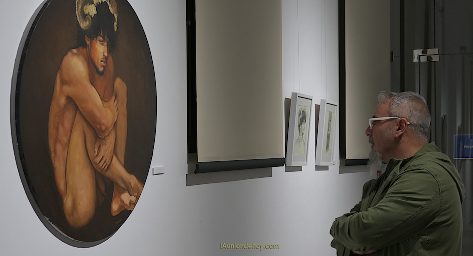 El unionense desveló que hay obras definitivas, como los dios Pan y Baco en novedosos lienzos circulares, y otras en las que ha aplicado la pintura digital, además de ofrecer bocetos por culminar elaborados en grafito. También explicó la estructura de la distribución por las tres paredes que rodean al malacate en la sala de exposiciones del Museo Minero.