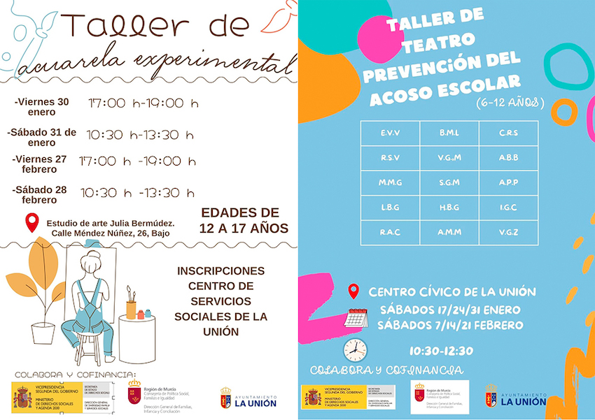 Servicios Sociales de La Unión ha iniciado el de teatro, que se centra en la prevención del acoso escolar y dura hasta el 21 de febrero, y la próxima semana arrancará el de acuarela experimental para jóvenes.