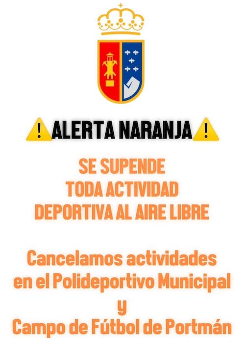 La Concejalía de Deportes, por su parte, comunica que se suspende toda la actividad deportiva al aire libre en las instalaciones deportivas del polideportivo municipal y en el campo de fútbol 'Las Palmeras' de Portmán por la alerta naranja. Otra cancelación afecta a la iniciativa de los miércoles (9 horas) 'Camina con tu enfermero'.