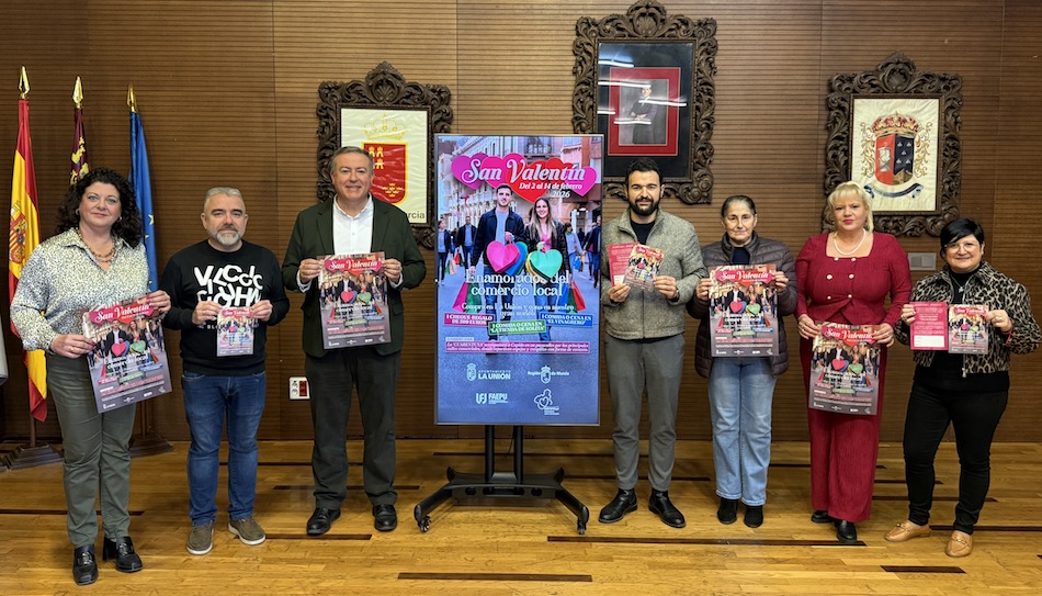 El alcalde de La Unión ha presentado en el Salón de Actos del Ayuntamiento la campaña “Enamorados del comercio local”, una iniciativa que se desarrollará del 2 al 14 de febrero con motivo de San Valentín y que tiene como objetivo fomentar las compras en los establecimientos del municipio y seguir impulsando el comercio de proximidad.