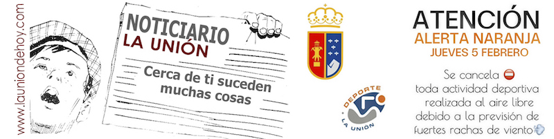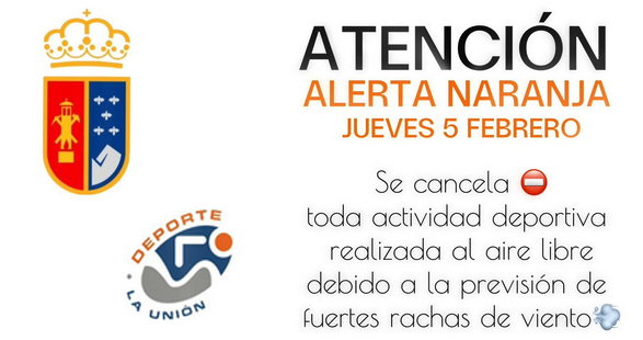 La AEMET ha activado el nivel naranja por fenómenos climáticos adversos para la jornada de hoy en el sureste de España, apuntando que se esperan rachas de viento de hasta 75 kilómetros de viento. Ante esta alerta, el Ayuntamiento de La Unión suspenda toda actividad deportiva para hoy en el municipio.