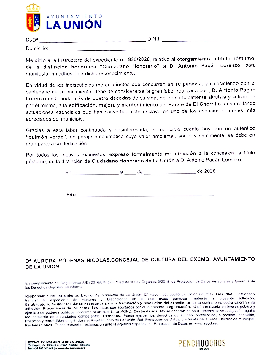 La iniciativa nace de los voluntarios de 'Salvemos El Chorrillo'. Recordar que en agosto de 2021 le fue concedida el nombre de una calle de la icudad de La Unión. Antonio Pagán había nacido el 14 de junio de 1926 en el seno de una familia minera y desde principios de los años ochenta del siglo XX, tras jubilarse por un expediente de crisis en la empresa Minera Celdrán, se volcó con este enclave de la naturaleza. Los documentos firmados por los vecinos serán remitidos a la concejalía de Cultura.
