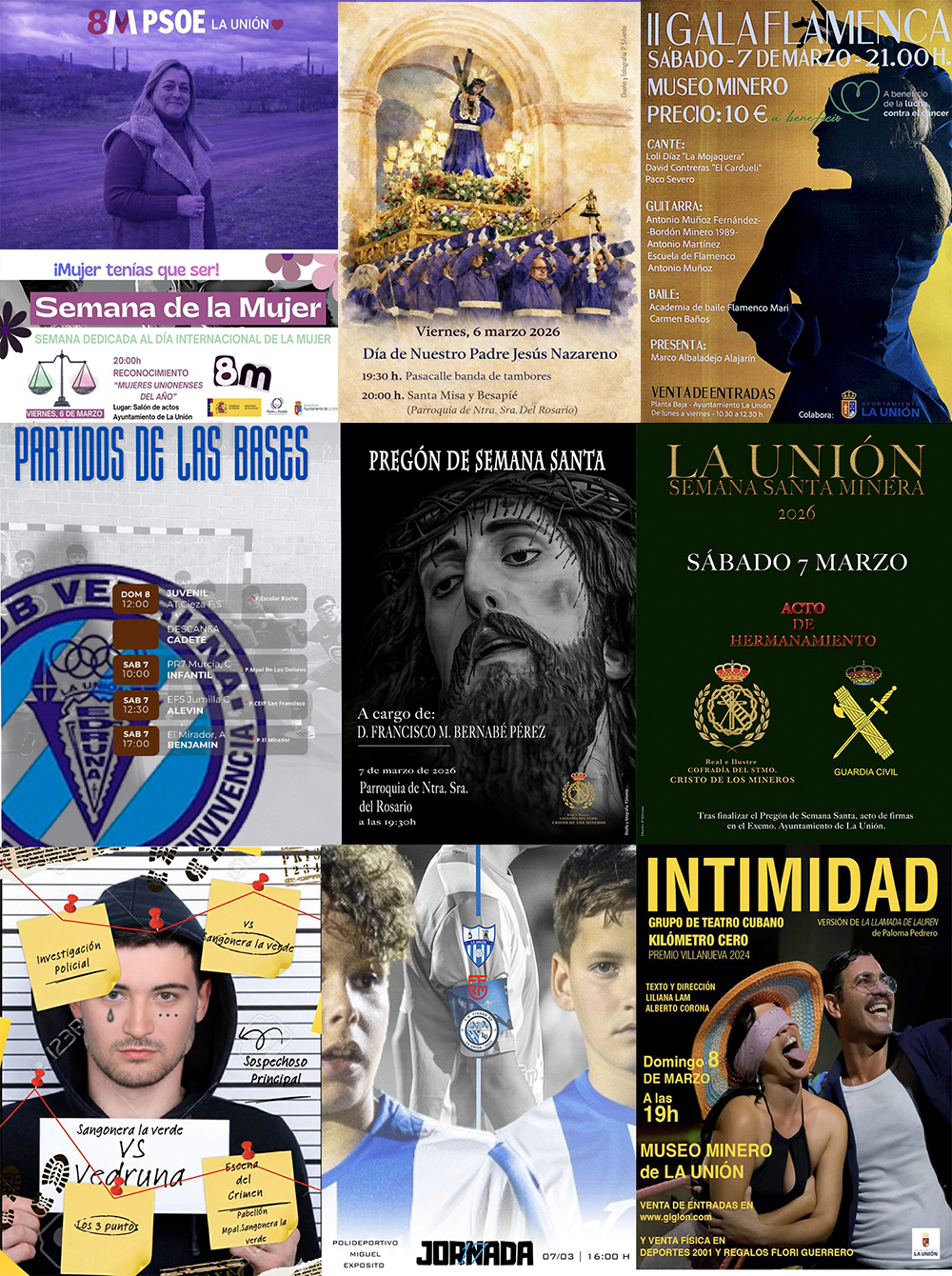 Tarde dedicada en la ciudad a homenajes a la mujer, primero en la sede socialista y, más tarde, en la del ayuntamiento. La actividad de cuaresma sigue destacando con besapié al Nazareno hoy y pregón de Semana Santa y hermanamiento cofrade con la Guardia Civil para el sábado. En el deporte ofrecemos horarios recibidos de los compromisos en las ligas del CD Vedruna, CB Sierramar y AD Algar Surmenor. En fútbol hay salida del CD Ciudad de La Unión, derbi vecinal juvenil entre Minera y AD La Unión y duelo en alevines entre los dos equipos unionenses. Otras propuestas son la gala flamenca de mañana y el teatro del domingo noche.