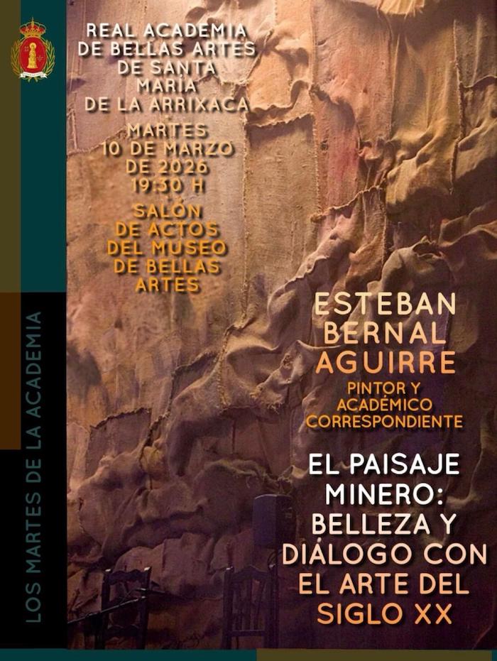El artista unionense Esteban Bernal Aguirre impartirá su primera conferencia como académico correspondiente de la Real Academia de Bellas Artes de Santa María de la Arrixaca de Murcia. Tendrá lugar este martes día 10 de marzo en el salón de actos del Museo de Bellas Artes de Murcia a las 19:30h en un acto de puertas abiertas hasta completar aforo.