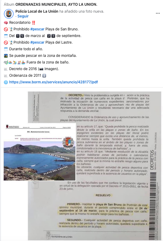 La Policía Local de La Unión informa que desde hoy y hasta el 23 de septiembre no se puede practicar la pesca en la playa larga de Portmán, recordando que en El Lastre está prohibido durante todo el año. Sí se puede en la zona de montaña, fuera de la zona de baño.