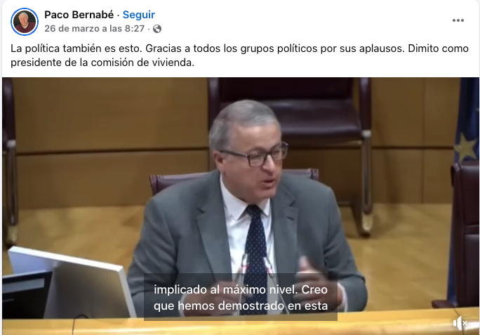 3. Francisco Bernabé ha hecho público a través de sus redes sociales que deja la presidencia de la comisión de vivienda en la Cámara Alta para centrarse en la labor de presidente de la comisión de investigación surgida después de la tragedia de Admuz: pinchar aquí