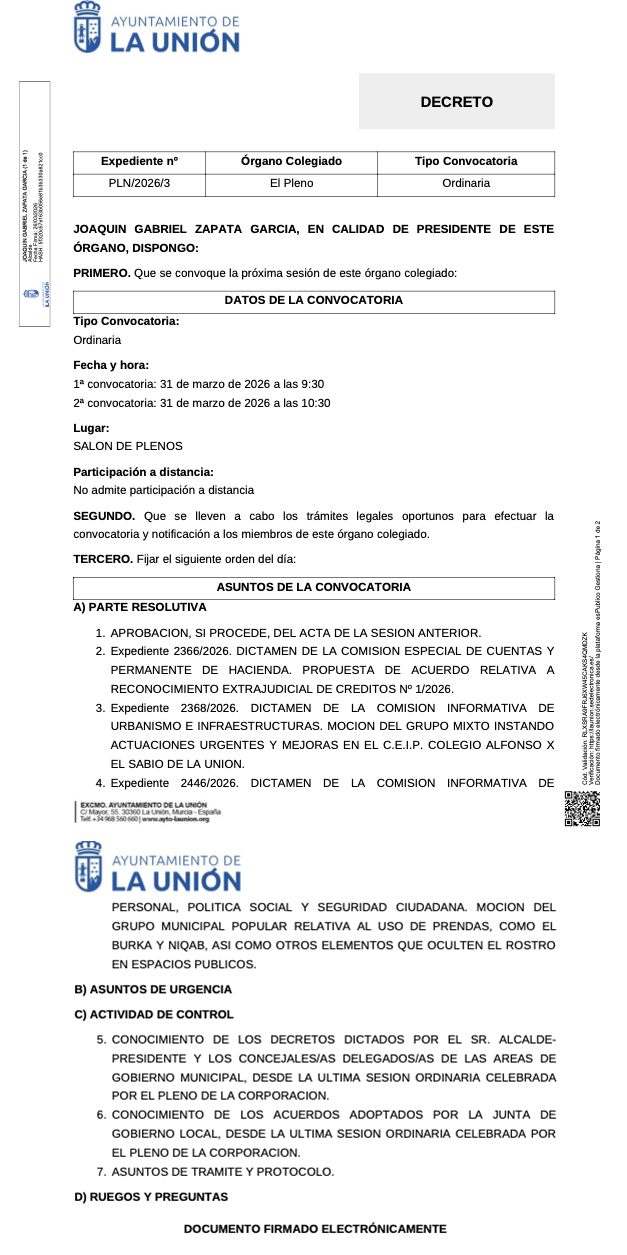 La moción que se presenta este martes en el salón de plenos de La Unión está dentro de la línea de las presentadas por este partido por toda España. Por lo que hemos conocido, han salido adelante en la mayoría, que no en todos, dependiendo de si VOX tiene mayoría o no en coalición con PP.