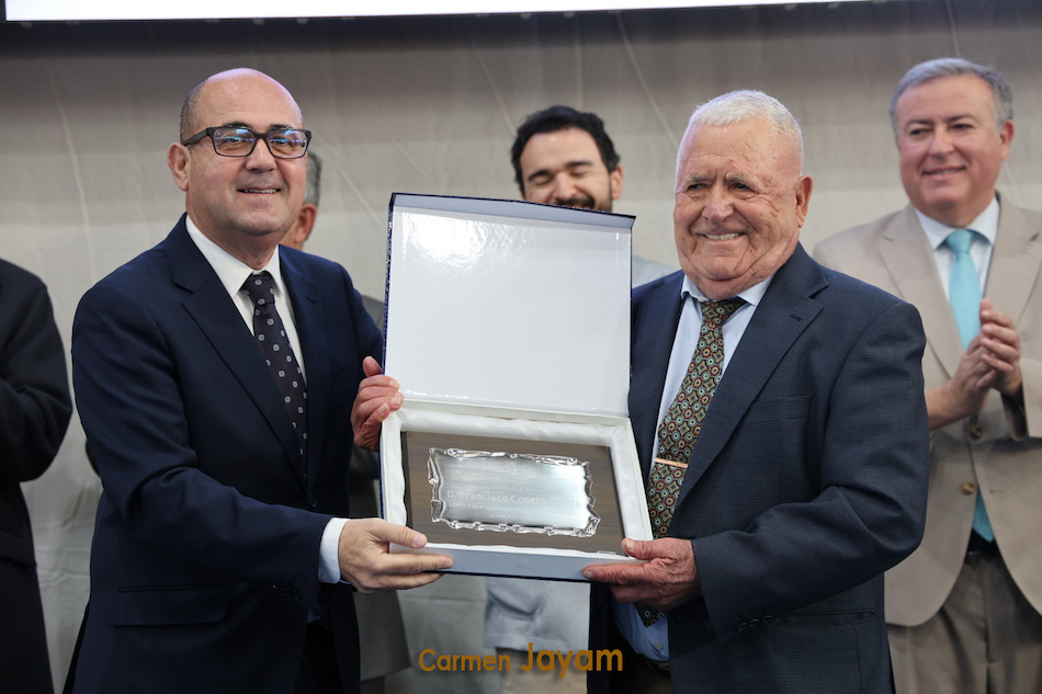 Francisco Conesa ha recibido una placa de manos del presidente de la Cámara de Comercio de Cartagena, Miguel Martínez Bernal, y otra que le entregaba Francisco Bernal de COEC Cartagena, además de una reprodución de un minero con su vagoneta, que entregaba el presidente de FAEPU y de la Feria, Carlos Fernándo Bernabé Pérez.