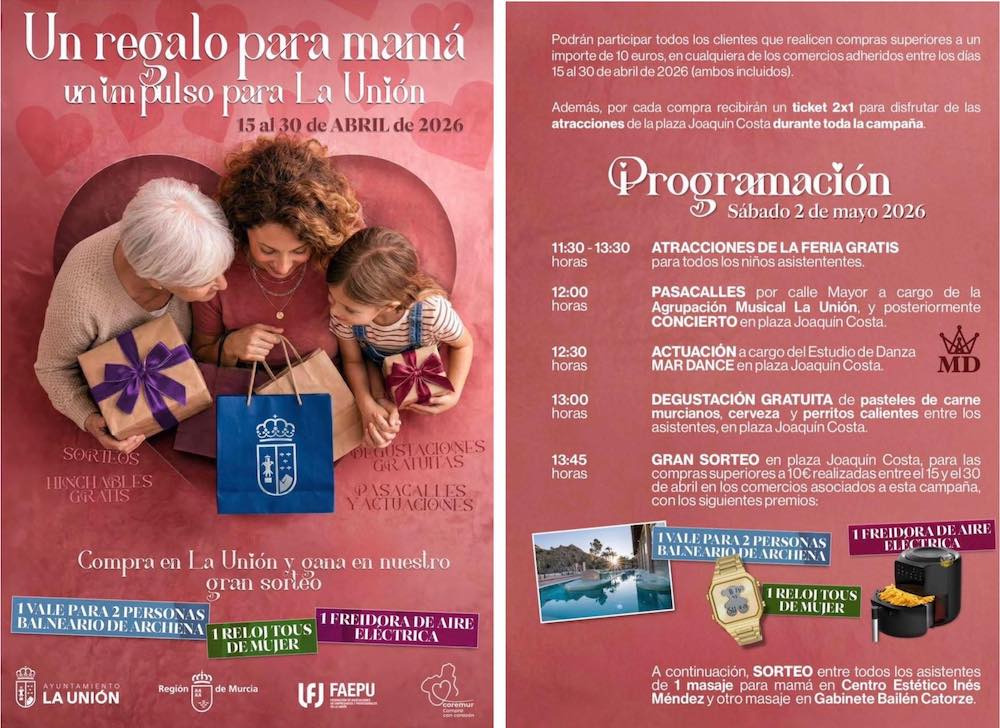 La campaña 'Un regalo para mamá, un impulso para La Unión' se desarrollará del 15 al 30 de abril de 2026, periodo durante el cual los clientes que realicen compras superiores a 10 euros en los establecimientos adheridos podrán participar en un gran sorteo.