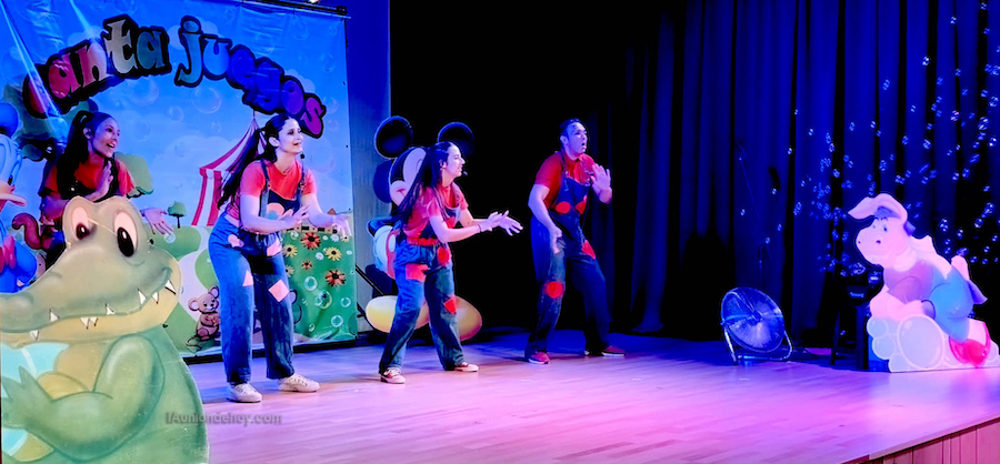 Un elevado número de niños y sus familiares pasaron una tarde muy animada en el salón de actos del Museo Minero con el cantajuegos del grupo 'Fantasía' titulado 'Bailando con burbujas'.