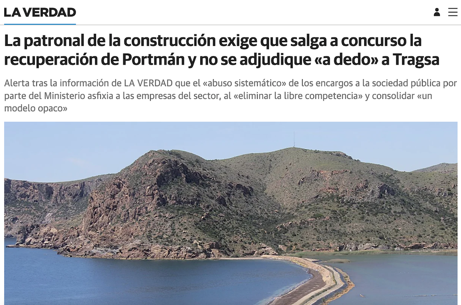 Al conocer esta noticia, La Federación Regional de Empresarios de la Construcción de Murcia (Frecom) ha mostrado hoy su rotundo rechazo a los planes del Miteco por adjudicar la obra 'a dedo' y exigen que se convoque un concurso público, publica La Verdad en artículo firmado por Zenón Guillén: pinchar aquí