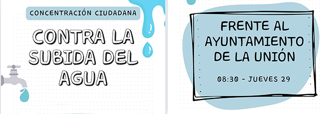 Un vecino de La Unión ha efectuado ante la delegación del Gobierno en la Región de Murcia una solicitud de concentración ciudadana para este jueves ante la fachada de la sede del ayuntamiento para mostrar el rechazo que se suba la tarifa del agua, lo que será abordado en el interior de la Casa del Piñón por los partidos políticos durante la celebración del pleno municipal. Por su parte, el partido político Podemos llama a una movilización ciudadana