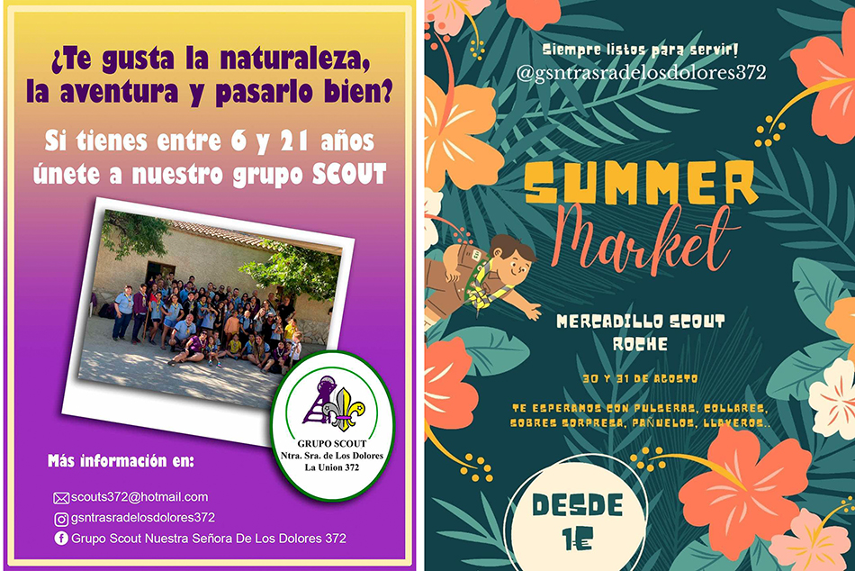 El grupo de Nuestra Señora de los Dolores de La Unión 273 abre el plazo para los chavales y jóvenes de 6 a 21 años de edad que se quieran apuntar como scouts o lobatos. Por otro lado, indicar que el colectivo escultista montará el viernes y sábado de esta semana un mercadillo en las Fiestas de Roche.