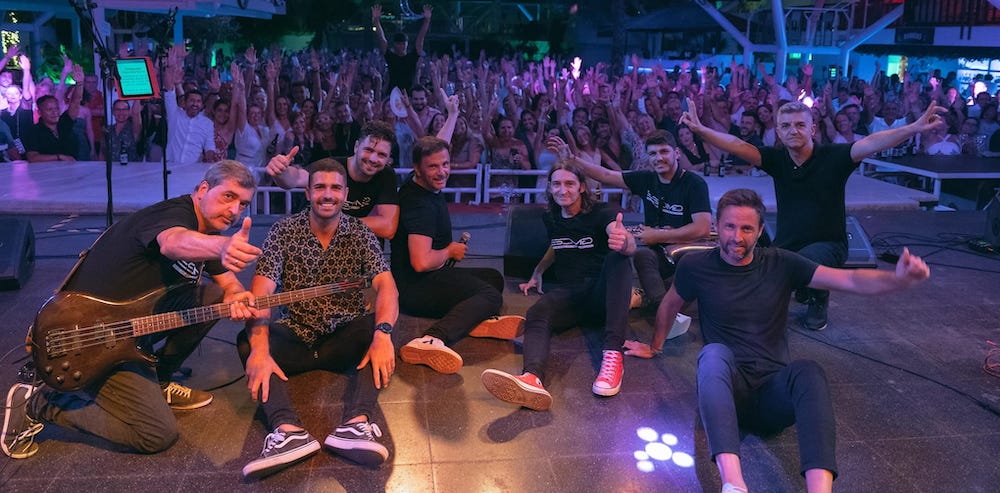 El grupo unionense de 'El Sitio de mi garaje' en la actuación que llevó a cabo este mes en 'Trips Summer Club'. En la otra imagen, en el campo de fútbol de Los Urrutias durantes las fiestas urrutienses que se están celebrando durante este verano.
