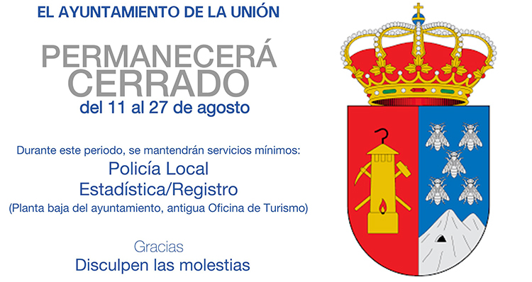 El gobierno municipal informa que desde hoy y hasta el miércoles 27 de agosto (domingo), el ayuntamiento permanecerá cerrado para garantizar las vacaciones del personal. Se mantendrán abiertos los servicios de registro/ estadística en la planta baja del edificio, antigua oficina de Turismo, y la Policía Local.