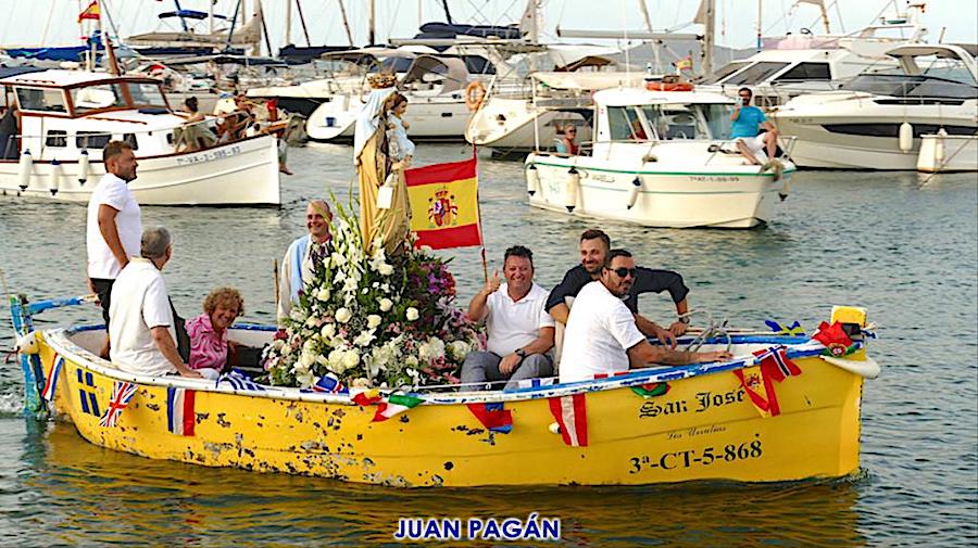 Francisco Ramón García, concejal del Ayuntamiento de La Unión, estuvo invitado a los actos en honor a la Virgen del Carmen en la localidad costera de Los Urrutias, donde el edil llegó a embarcarse (en la foto junto a la bandera nacional) con la imagen en el tramo de la procesión marítima.