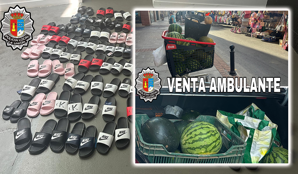 La Policía Local ha incautado 183 chanclas de playa, abriendo diliencias por un delito contra la propiedad intelectual al considerar que son falsificaciones de marcas. Además, se han recogido y donando a asociaciones benéficas más de cien kilos de melones, sandías, calabazas y ajos que se estaban vendiendo sin licencia de venta ambulante ni pago de impuestos. Ambas actuaciones han tenido lugar en el mercadillo de la ciudad de La Unión.