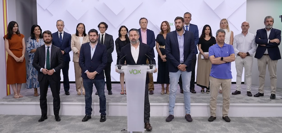 El secretario general, Santiago Abascal, anuncia la ruptura de los gobiernos autonómicos de coalición con el Partido Popular en la Región de Murcia, Aragón, Castilla y León, Comunidad Valenciana y Extremadura, pero, en principio, no tendrá réplicas en los gobiernos locales donde gobiernan en coalición.