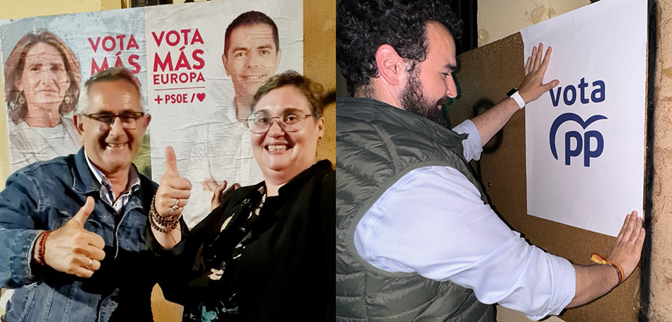 La pasada medianoche, con la pegada de carteles, comenzó la campaña electoral de los comicios a la Unión Europea que se celebrarán el próximo 9 de junio. En las fotos superiores, escenas en La Unión de PSOE y PP. Vox, por su parte, anuncia que hará campaña este sábado en el mercadillo de Portmán.