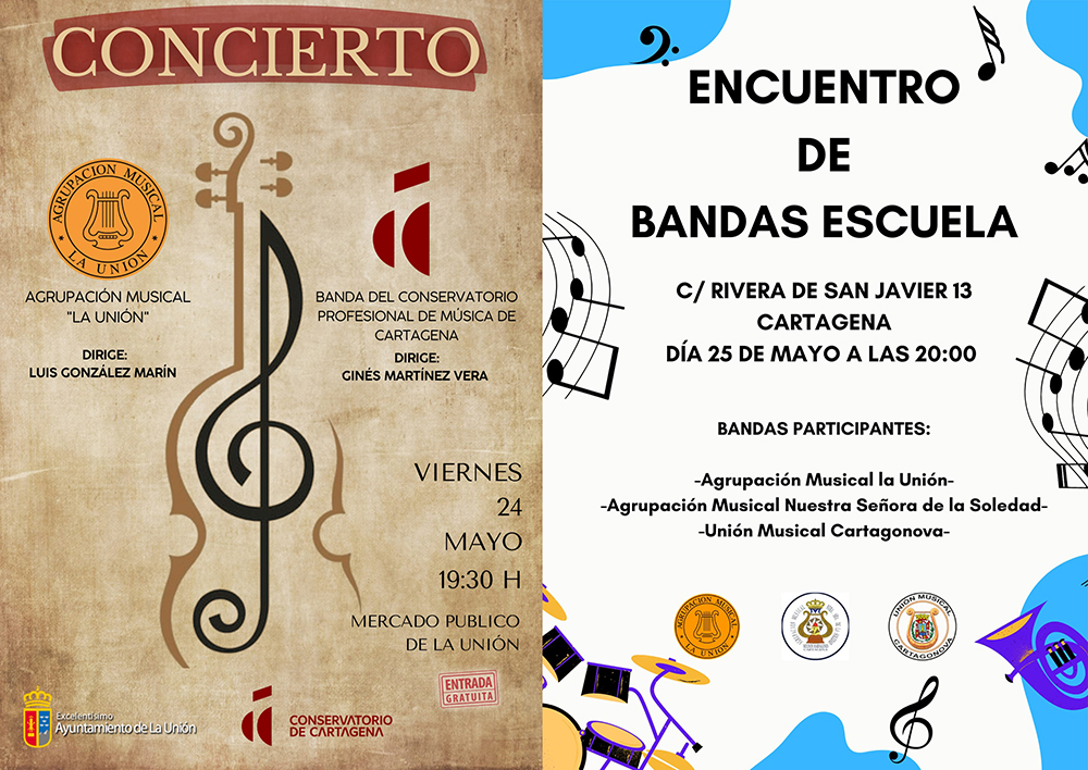 Agrupación Musical La Unión ofrece este viernes un concierto junto a la 'Banda del conservatorio profesional de música de Cartagena' en el Mercado Antiguo y al día siguiente se trasladará a la ciudad portuaria para participar en el encuentro de bandas que organiza unión Musical Cartagonova.