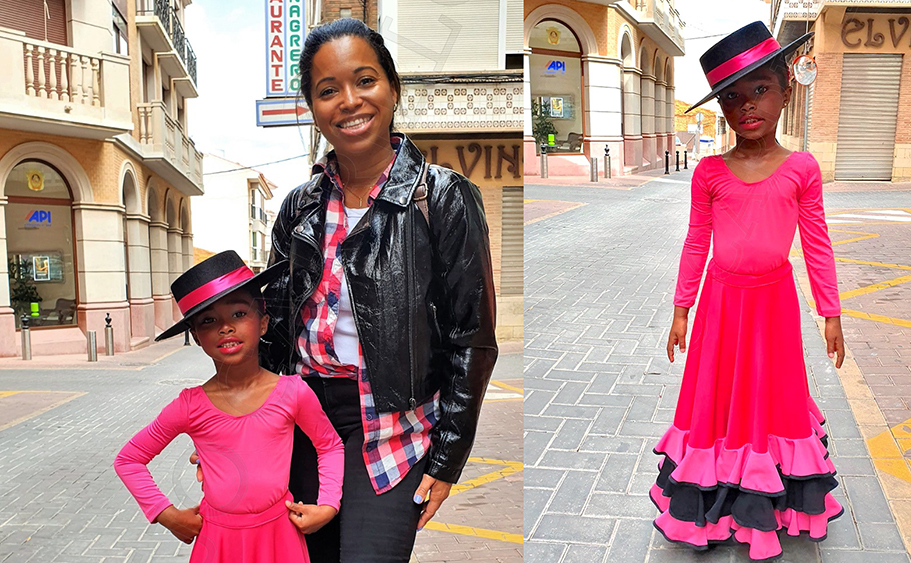 La foto muestra a la pequeñín flamenca Keisi con vestuario flamenco junto a su madre, Kenia, en la mañana del sábado, cuando se dirigían al Mercado Antiguo, donde tuvo lugar la fiesta del 'Día internacional de la danza' organizada por Artedanza.