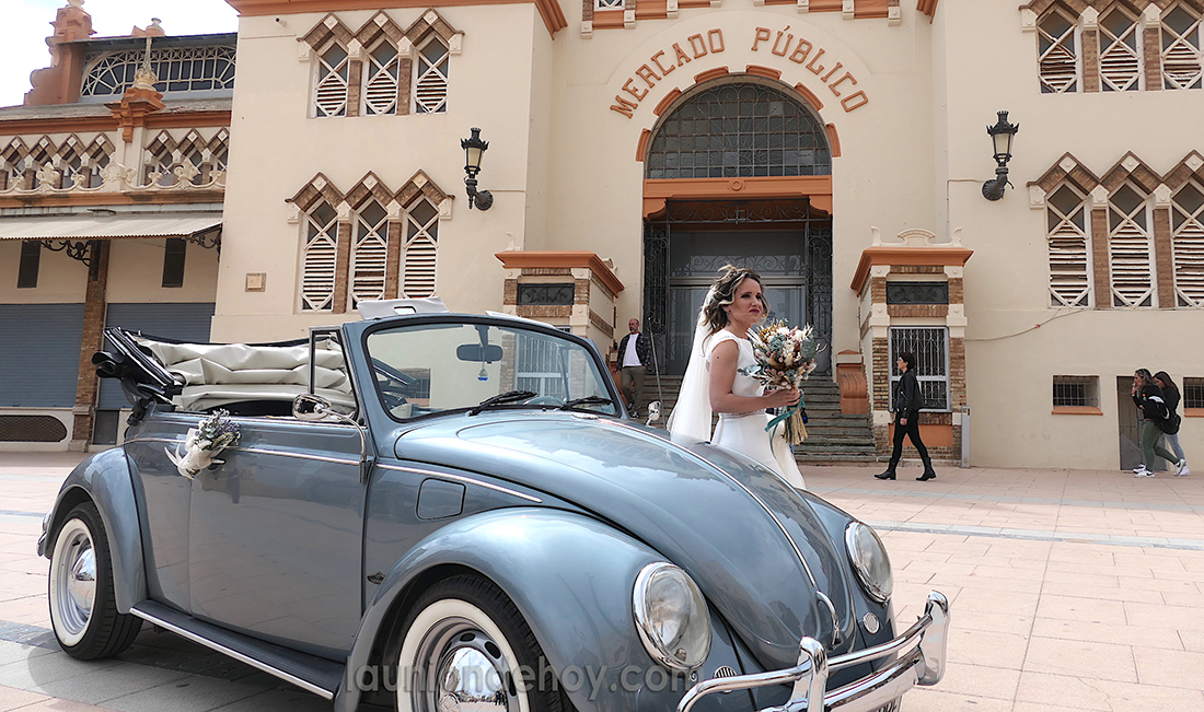 La unionense Maricarmen fue objeto de un reportaje de fotos con un coche clásico ante el modernista Mercado Antiguo, en una ventosa matinal del sábado, antes de dirigirse a su enlace matrimonial con Antonio.