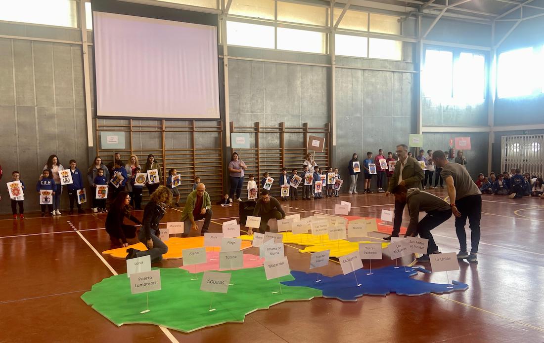 El acto de inauguración contó con los alumnos apareciendo sobre el parqué del pabellón por etapas y cursos llevando siluetas de los municipios de la Región de Murcia, los cuales fueron colocando, con ayuda del profesorado, por comarcas a modo de puzzle hasta completar el mapa autonómico, además de ubicar sus escudos.