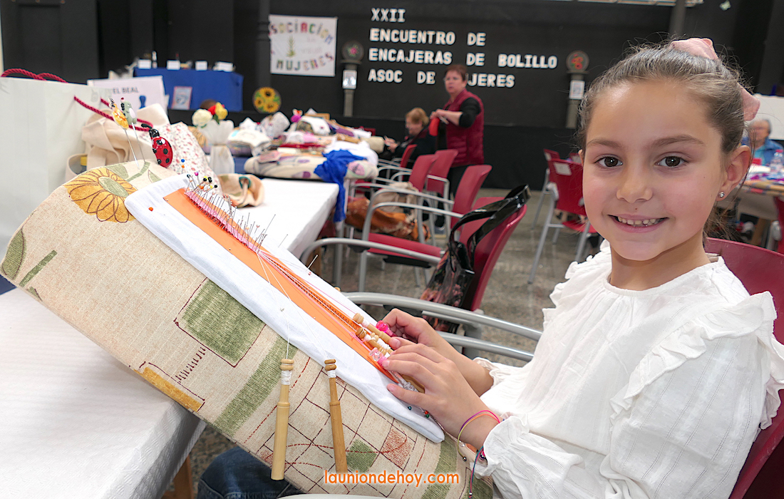 Emma Escudero García, vecina de El Garbanzal, fue la encajera de menor edad de las ciento cincuenta y seis participantes en la vigésimo segunda edición del encuentro organizado por la Asociación de Mujeres de La Unión, que también sirvió para que se conozca más el Museo Minero.