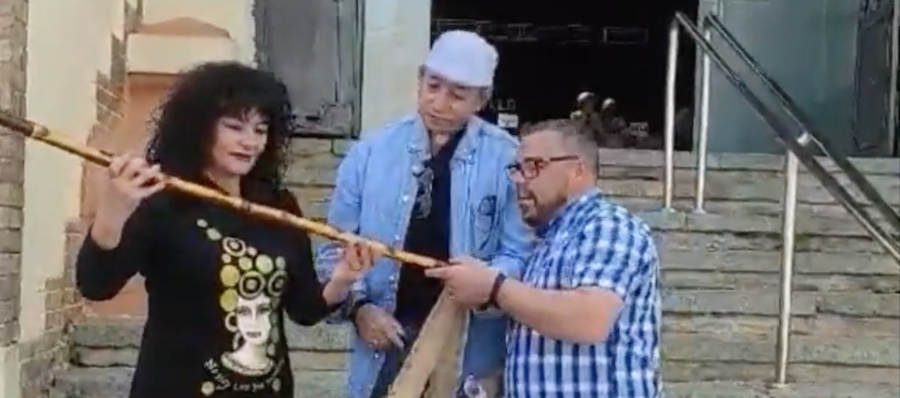 La 'Vara de La Unión' ha sido entrega por Reinaldo Calle a Fini Rubio, profesora del colegio Leonardo Da Vinci de Los Belones ante la fachada del Mercado Público, con la sorpresa de que la agasajada, a su vez, entregó una placa a quien le había entregado la distinción.