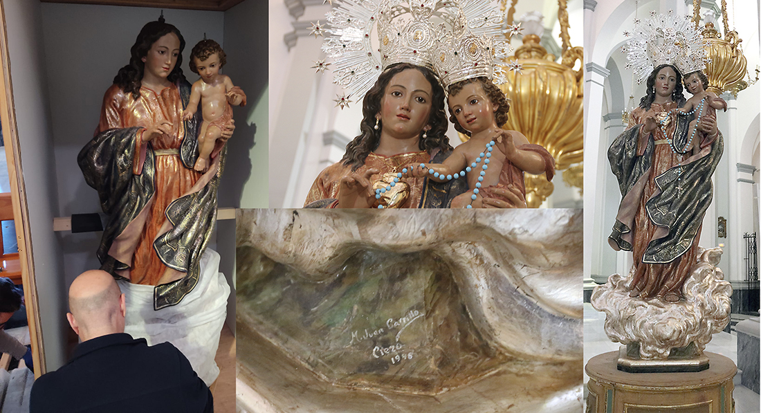 La Virgen del Rosario estará expuestas en un lateral del altar para que los vecinos puedan ver de cerca cómo ha quedado la imagen tras diez meses de trabajos de restauración en Murcia, lo que ha permitido que recupere la faz morena de su rostro, como era propio de la mujer hebrea en el lugar donde vivió María. También ha aparecido la firma del autor, el ciezano Manuel Carrillo. Ofrecemos reportaje gráfico del regreso de la talla a su 'casa'.