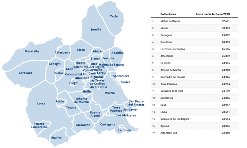 El diario digital 'Murcia plaza' publica hoy un artículo en el que ofrece un clasificación de los 45 municipios de la Región de Murcia en base a la media de las rentas de 2023, según los datos de la estadísticas de declarantes del IRPF en ese ejercicio. Los primeros puestos son para Molina de Segura, Murcia, Cartagena y San Javier, por ese orden, mientras los tres últimos puestos los ocupan Ricote, Albudeite y Moratalla.